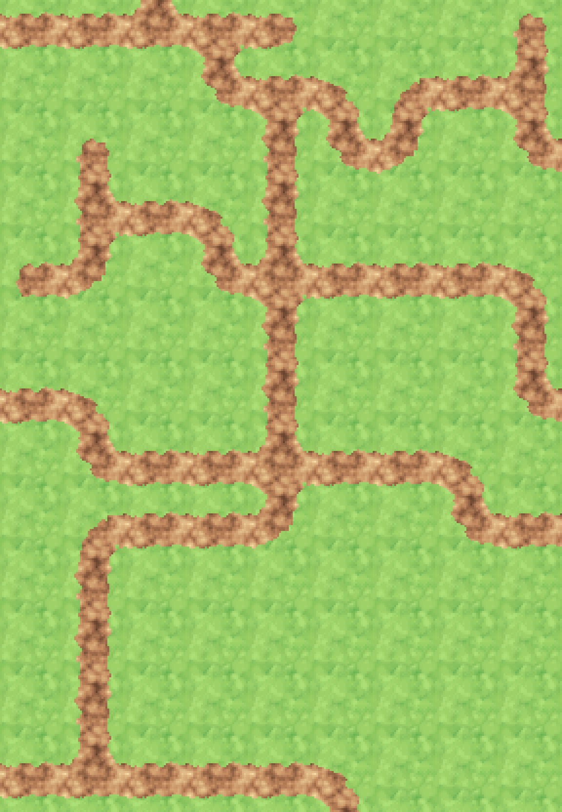 Dirt paths in the style of the paths in Hyrule Field from Ocarina of Time. The paths are split into rearrangeable texture tiles to allow for easy construction of path networks leading from one game site to another.