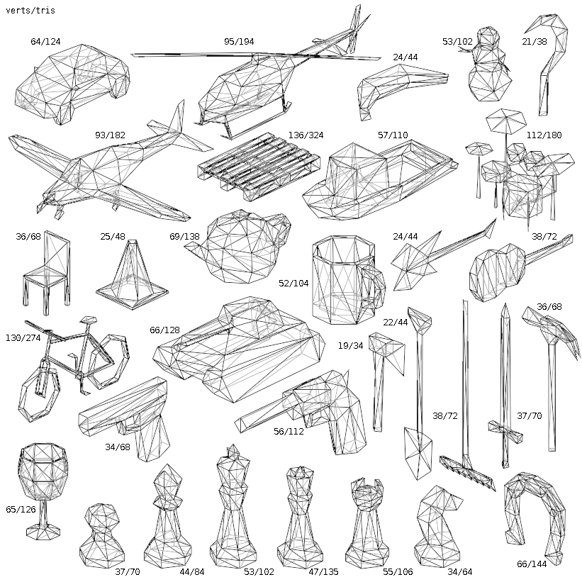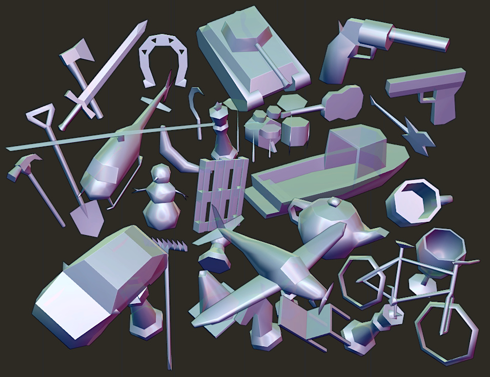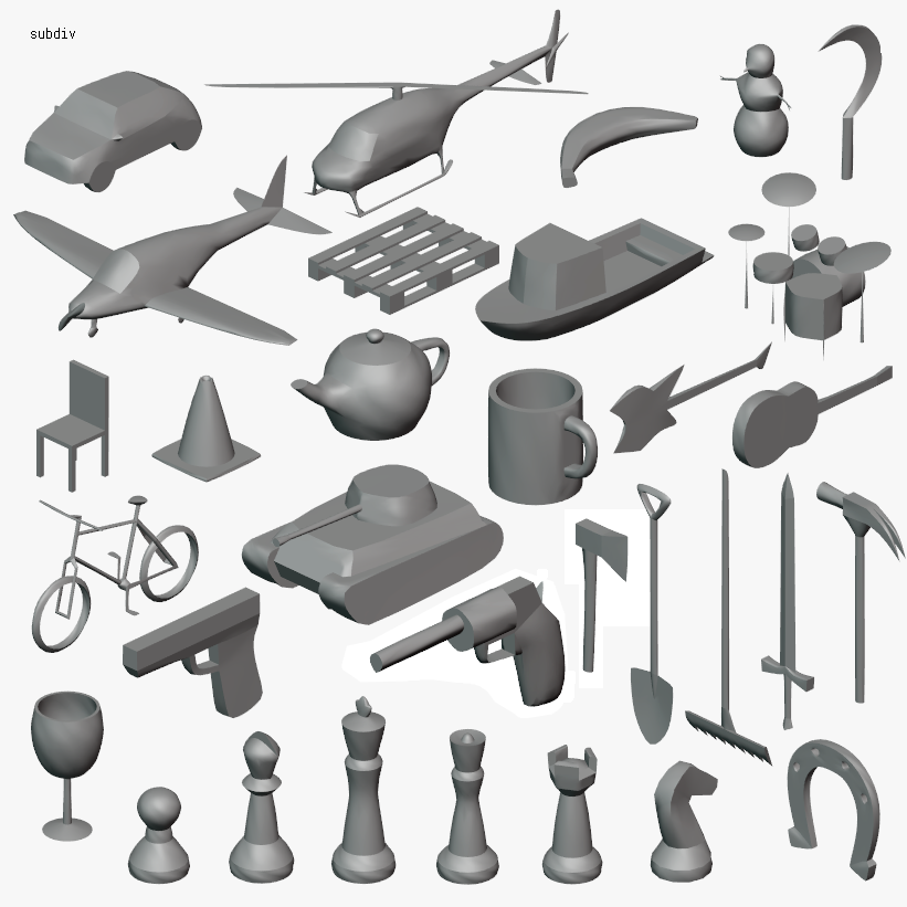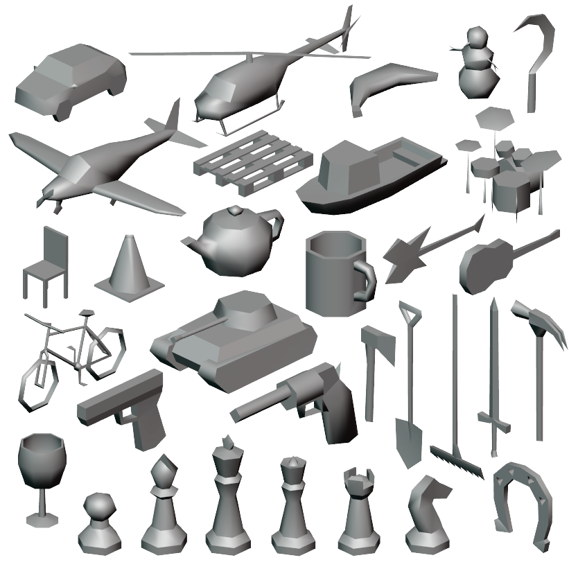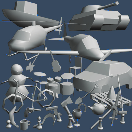 This is a collection of 32 low-poly models of common objects which I have made with Blender. The models are hand-crafted and manually optimized for low vertex and polygon count, they were made as an exercise to make simple shapes from scratch without retopology and can serve as models in "low poly" games, as testing models or be a basis for more complex models. No existing "brands" are depicted, everything is 100% public domain. All model faces are triangles (and correctly oriented of course). Selected edges are marked as sharp so that the models have normals and edges also have the cease property set so that you can use the Blender's subdivision modifier to automatically get smoother, higher-poly models. The models are also in relative scale to each other. The models do NOT have textures, materials, UV maps, rigs, moving parts or animations.