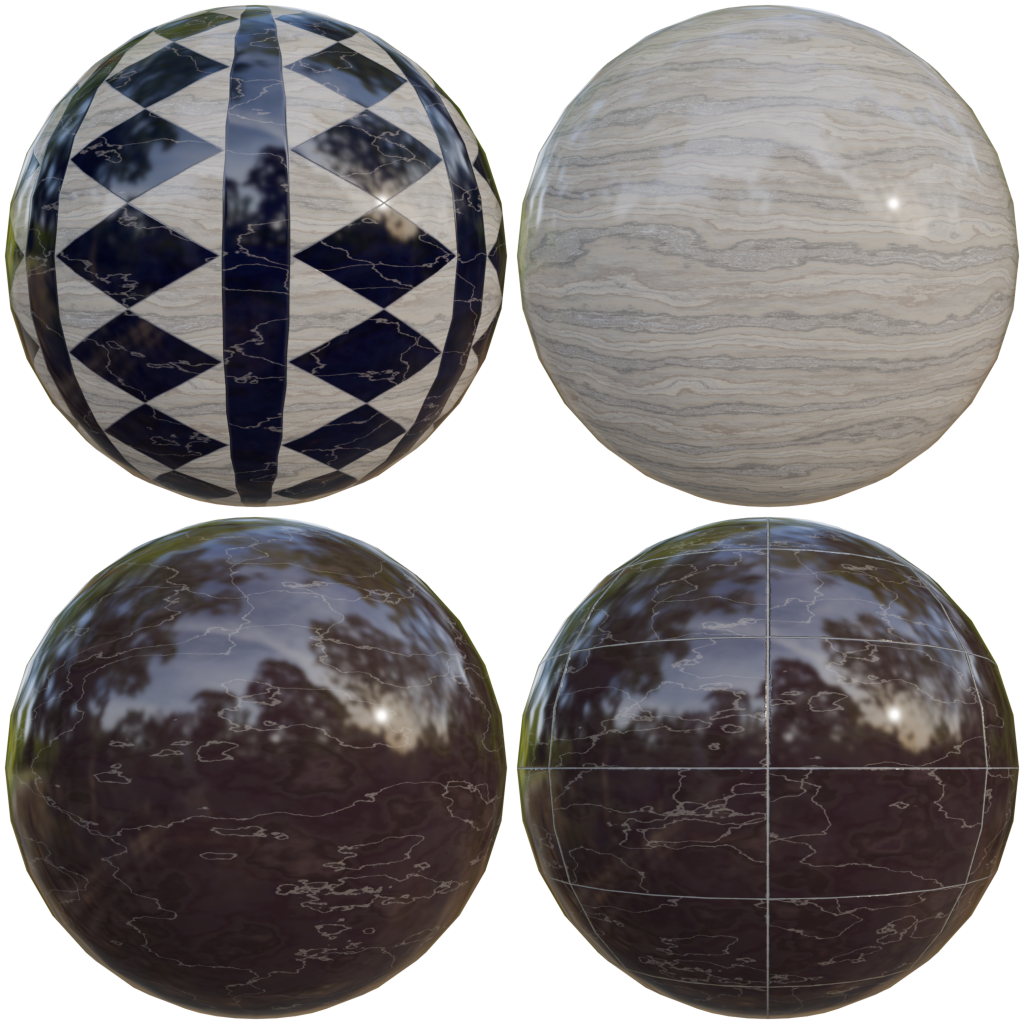 A set of marble and tile marble textures. The base marble only comes with the color texture. The tiles include color, rough, and normal. All textures are 2048 x 2048. The original Material Maker and Blender files are included. The tiling surface area is based off a 2 x 2 meter grid