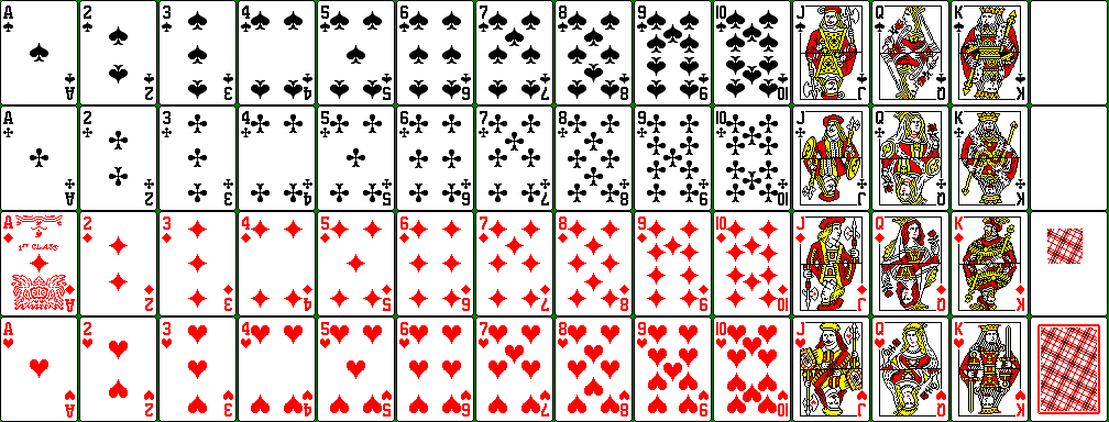 This is a set of 52 pixel-art playing cards designed with the same size and color palette as Susan Kare's original Solitaire card set (as used in MS Windows from 3.0 to XP), but instead derived from Adolf Charlemagne's "Satin Deck" design (which became the most common design for playing cards used in Imperial Russia and the Soviet Union).
