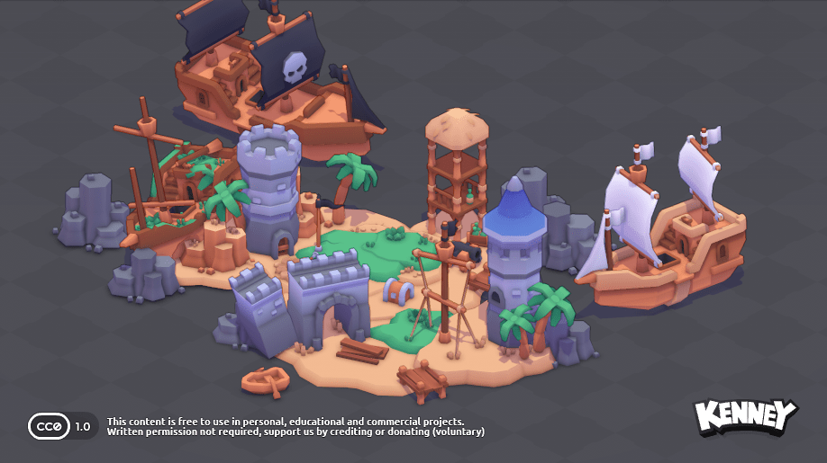 This package includes 60 pirate themed objects including ships, treasure, trees, rocks and more!
