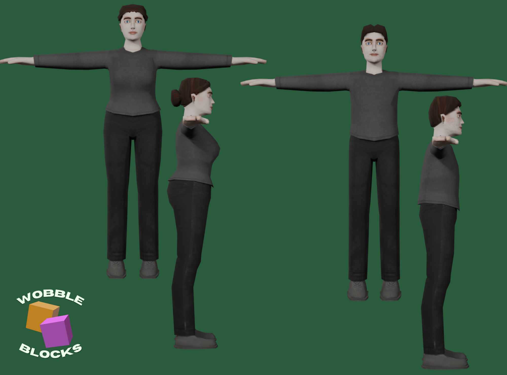 The rigged low poly PS2/mid-2000s character bases I made for our current project Maihem Colony!