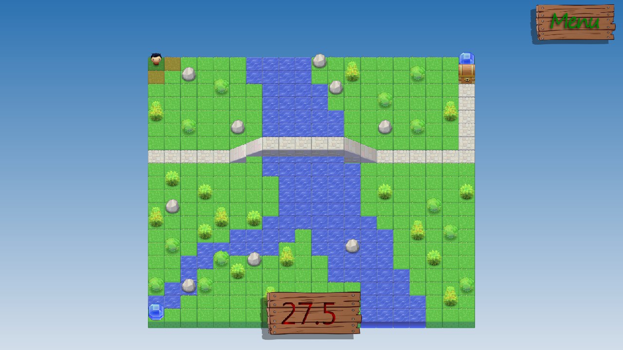 It can have objects on the map, which can be obstacles (trees, stones,..) or special, for example teleporting stone or vehicles (at the moment only boat), or a key that the player has to take to finish the level.